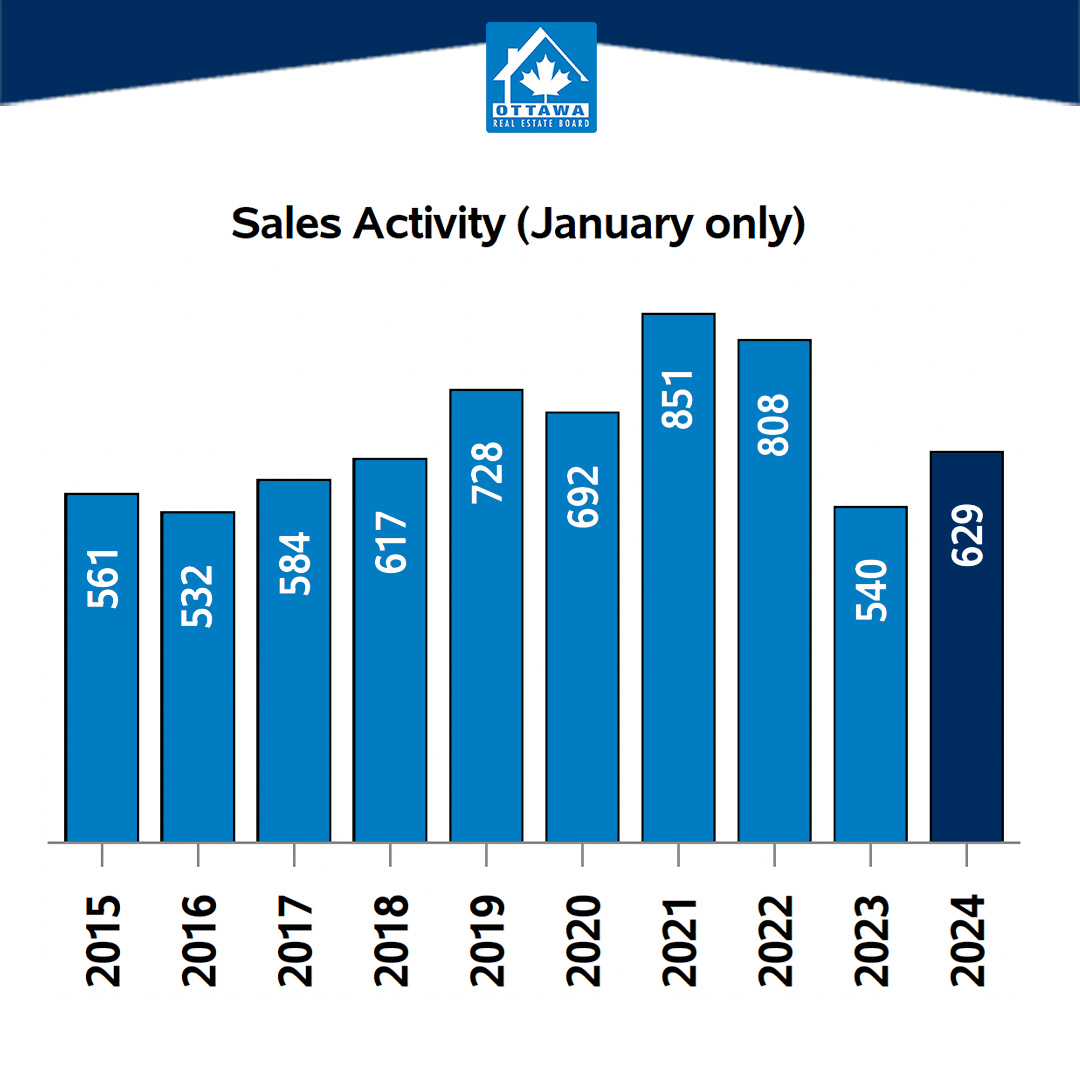 The number of homes sold through the MLS® System of the Ottawa Real Estate Board was 629 units in January 2024. This was an increase of 16.5% from January 2023.